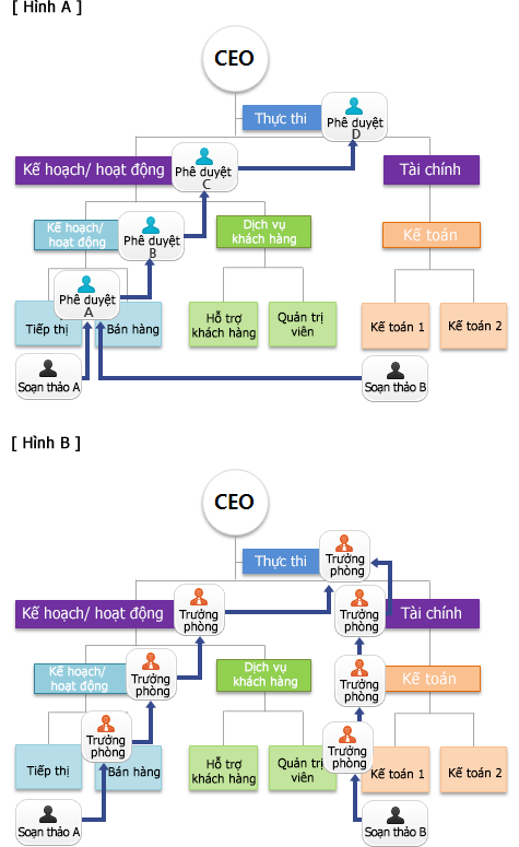 1. Chọn người phê duyệt chính từ danh sách trong cây tổ chức trên cửa sổ hướng phê duyệt. 2. Số người phê duyệt có thể được thêm vào nhiều như số trường chử ký trong form phê duyệt. Có hai cách để lựa chọn hướng phê duyệt, đó là người phê duyệt cố định (hình A) và nhiều người phê duyệt (hình B).