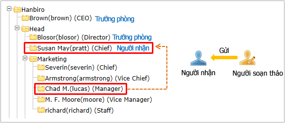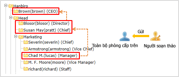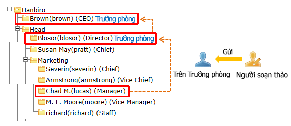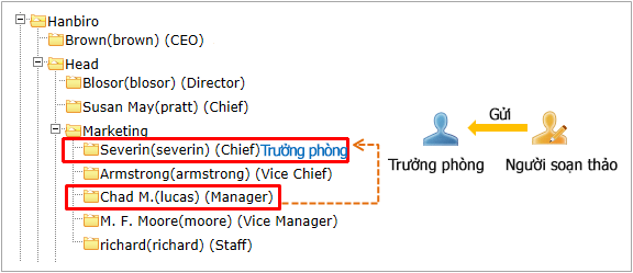 1) Khi lựa chọn [Trưởng phòng của phòng soạn thảo.], hướng phê duyệt sẽ thiết lập tự động như trưởng phòng trở thành người phê duyệt.